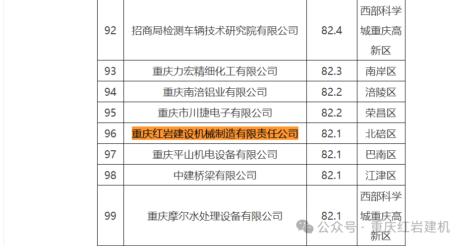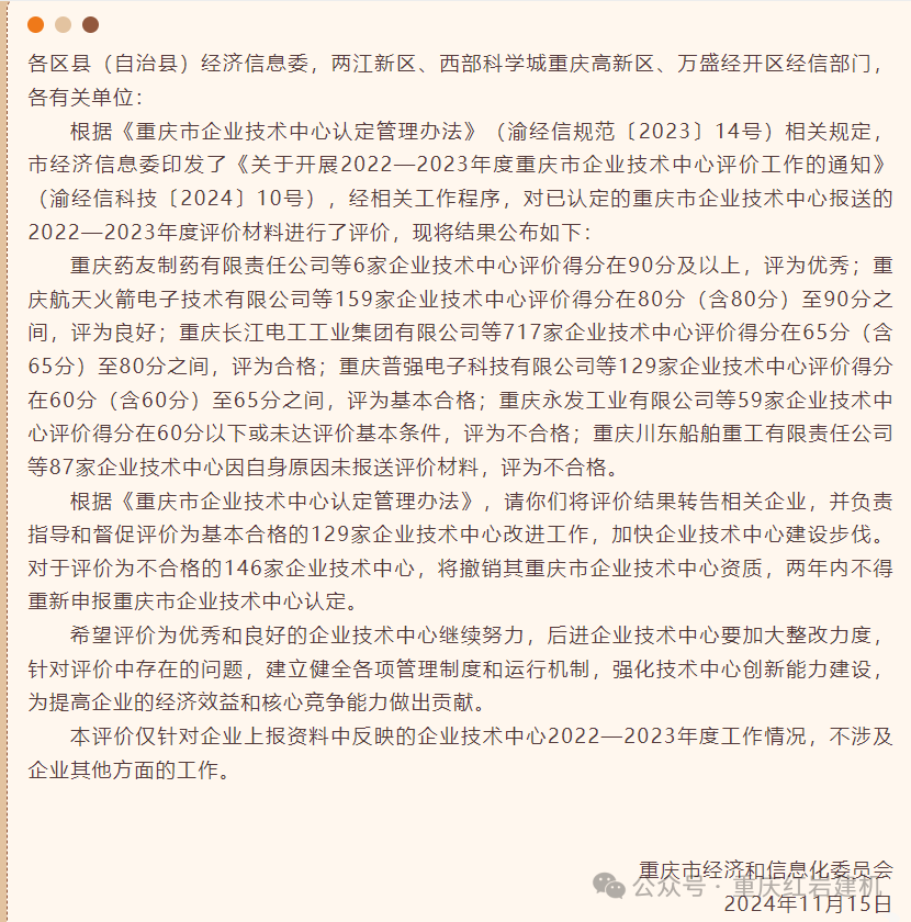 11月15日,重慶市經(jīng)濟(jì)和信息化委員會(huì)發(fā)布《重慶市企業(yè)技術(shù)中心2022—2023年度評(píng)價(jià)結(jié)果》,其中6家企業(yè)評(píng)分90分以上為優(yōu)秀;159家企業(yè)評(píng)分80分以上為良好;717家企業(yè)評(píng)分在65分以上為合格;129家企業(yè)評(píng)分在60-65分之間為基本合格;59家企業(yè)在60分以下為不合格。我公司獲得82.1評(píng)分為良好,序號(hào)排名96。