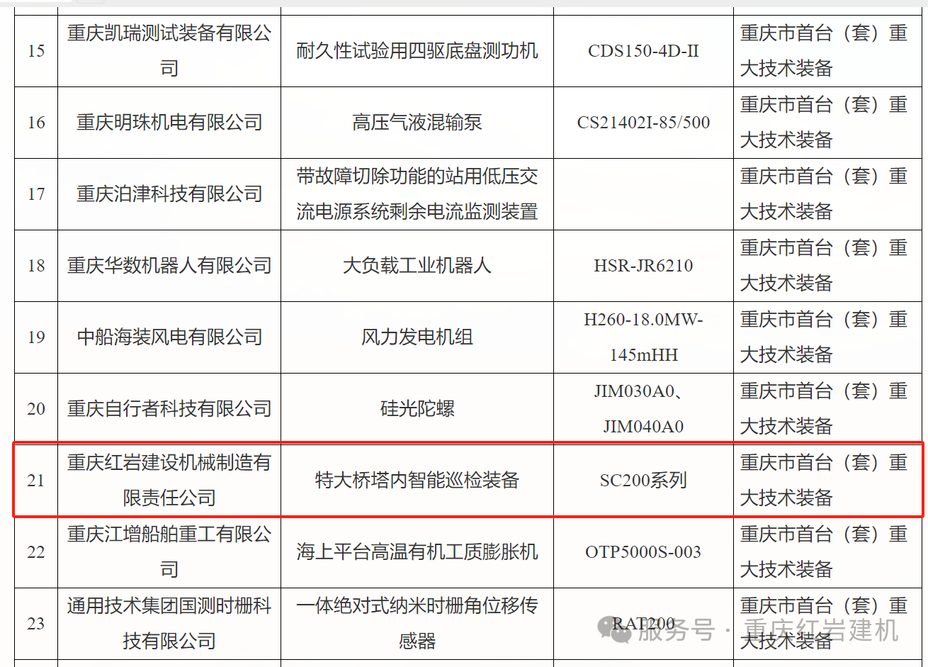 按照《重慶市首臺(tái)(套)重大技術(shù)裝備認(rèn)定管理辦法》(渝經(jīng)信規(guī)范〔2022〕5號(hào))規(guī)定,重慶市經(jīng)濟(jì)和信息化委員會(huì)已按程序?qū)Φ谌陥?bào)的重慶市首臺(tái)(套)重大技術(shù)裝備產(chǎn)品進(jìn)行了專家評(píng)審,共計(jì)64個(gè)產(chǎn)品通過評(píng)審并排序。我司《特大橋塔內(nèi)智能巡檢裝備》排名21,成功入選第三批重慶市首臺(tái)(套)重大技術(shù)裝備產(chǎn)品名錄。